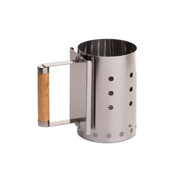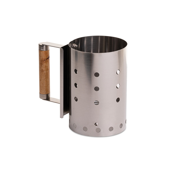 Mechero de 1kg de capacidad, fabricado en acero inoxidable con mango de madera. Ideal para encender nuestro carbón de cáscara de coco.